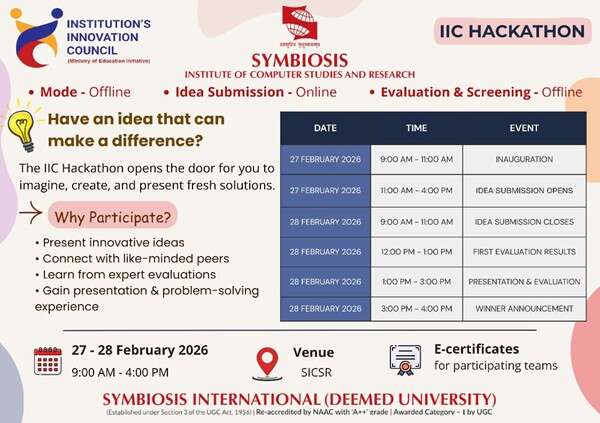 The Smart India Hackathon (SIH) 2025 is a nationwide initiative aimed at empowering students to develop innovative solutions to real-world challenges. Launched by the All-India Council for Technical Education (AICTE) and the Ministry of Education (MoE), SIH has consistently provided students with a valuable platform to gain diverse perspectives, enhance problem-solving abilities, and design efficient, impactful solutions. As part of this prestigious initiative, the Symbiosis Institute of Computer Studies and Research (SICSR) organized an Internal Hackathon to identify and nurture promising talent for the national stage. The event began with team registrations, followed by the official inauguration on 25th September 2025. A total of 10 teams, comprising 58 students, participated in the competition. Participants were given 24 hours, from 9:00 AM on 25th September 2025 to 26th September 2025, to develop and present innovative solutions for problem statements selected from the official SIH portal.